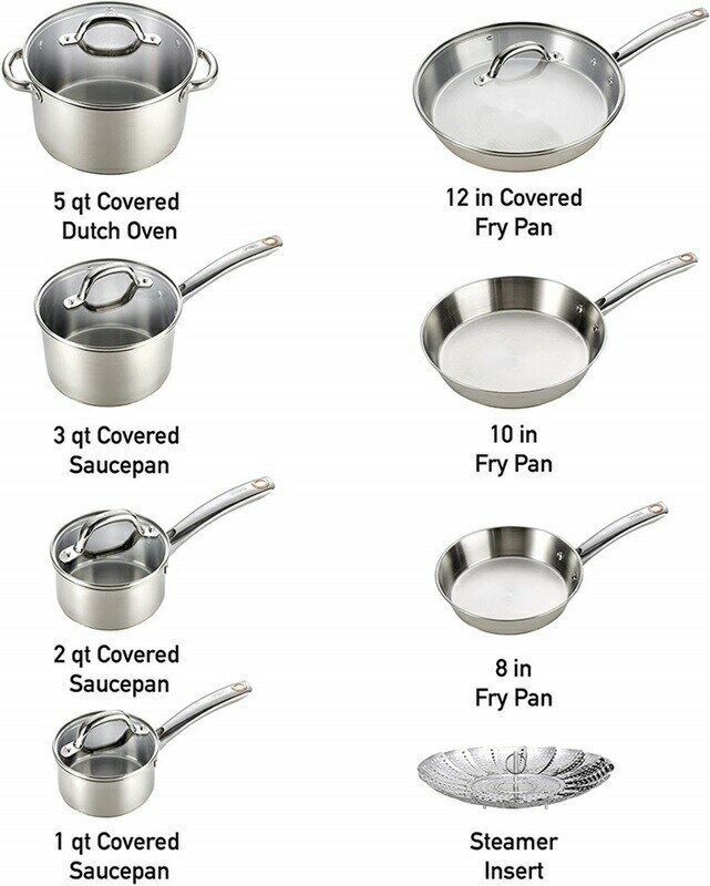T-fal C836SD Ultimate Stainless Steel Copper Bottom 13 PC Cookware Set, Dishwasher Safe Pots and Pans Set, Silver セット内容:8インチフライパン、10.5インチフライパン、蓋付き12インチフライパン、蓋付きクォートソースパン1個、クォート2個;蓋付き鍋、3クォート;蓋付き鍋、5クォート;ふたとステンレス製の蒸し器付きダッチオーブン 多層強度:銅、ステンレス鋼、アルミニウムの複数の層を備えた重いゲージベースは、高速で均一な熱を発生します。