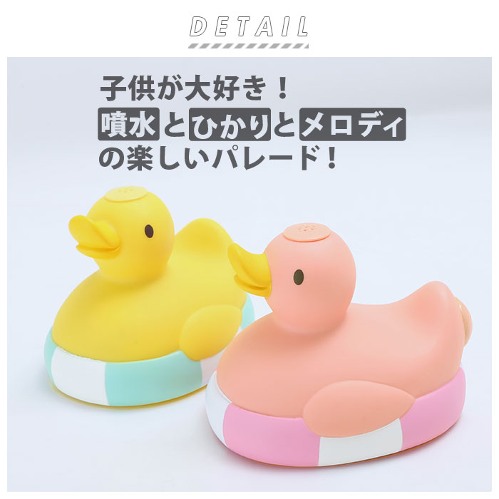 噴水は、アヒルの頭から15cm以上吹き上がる!・お水に浮かべると自動で電源が入り、水を噴き出しながら7色に光ってエレクトリカルパレードのメロディーが流れだす♪