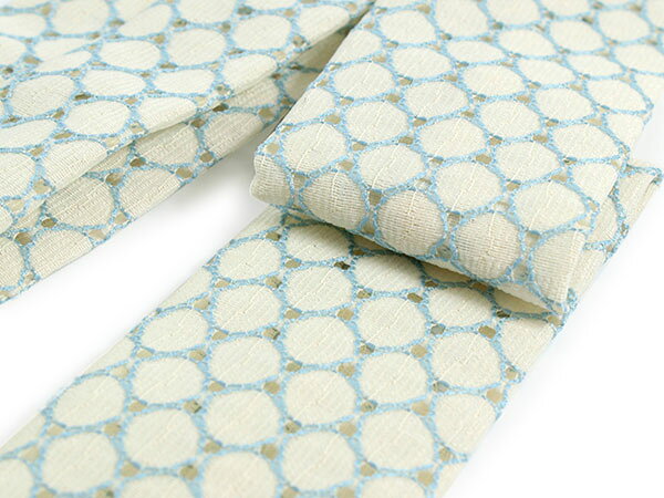 商品 レース腰紐 並尺 単品 クリーム×水色の水玉幾何学模様のレース サイズ 約 2m15cm 素材・品質 ポリエステル100%・日本製 重さ:37g 着用時期 一年中ご使用いただけます。